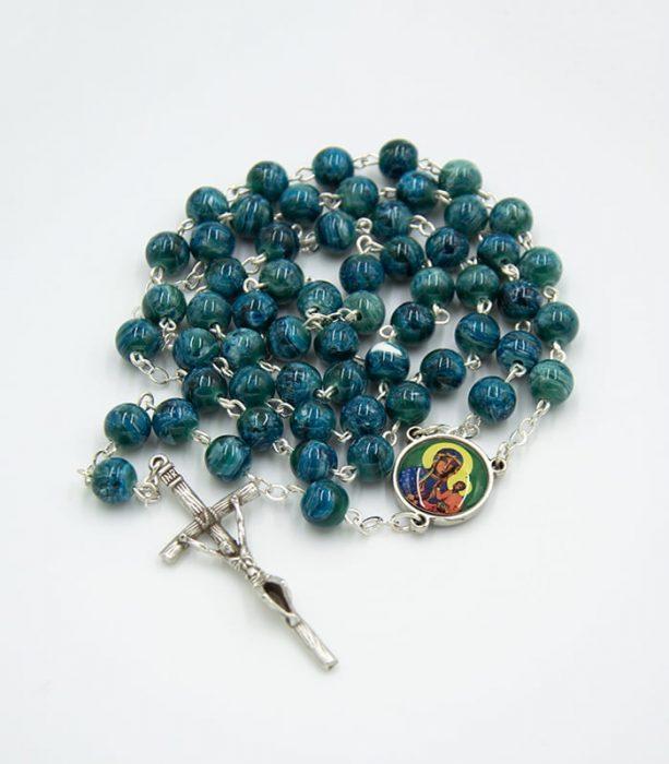Różaniec plastikowy imitujący kamień, morski na drucie z logotypem Żywego Różańca i wizerunkiem Matki Bożej Częstochowskiej (wizerunek kolorowy, naklejany).